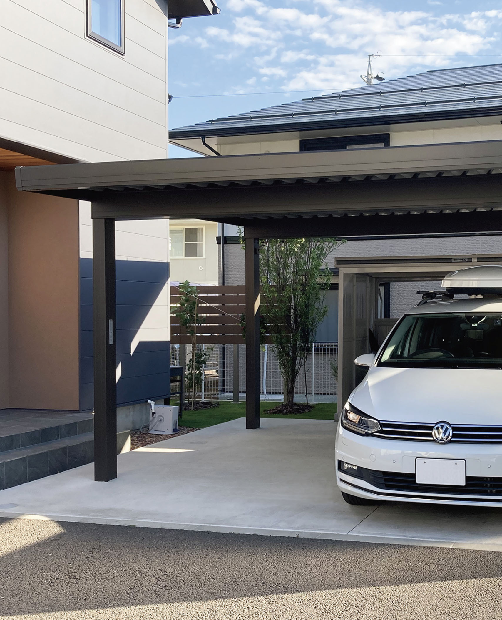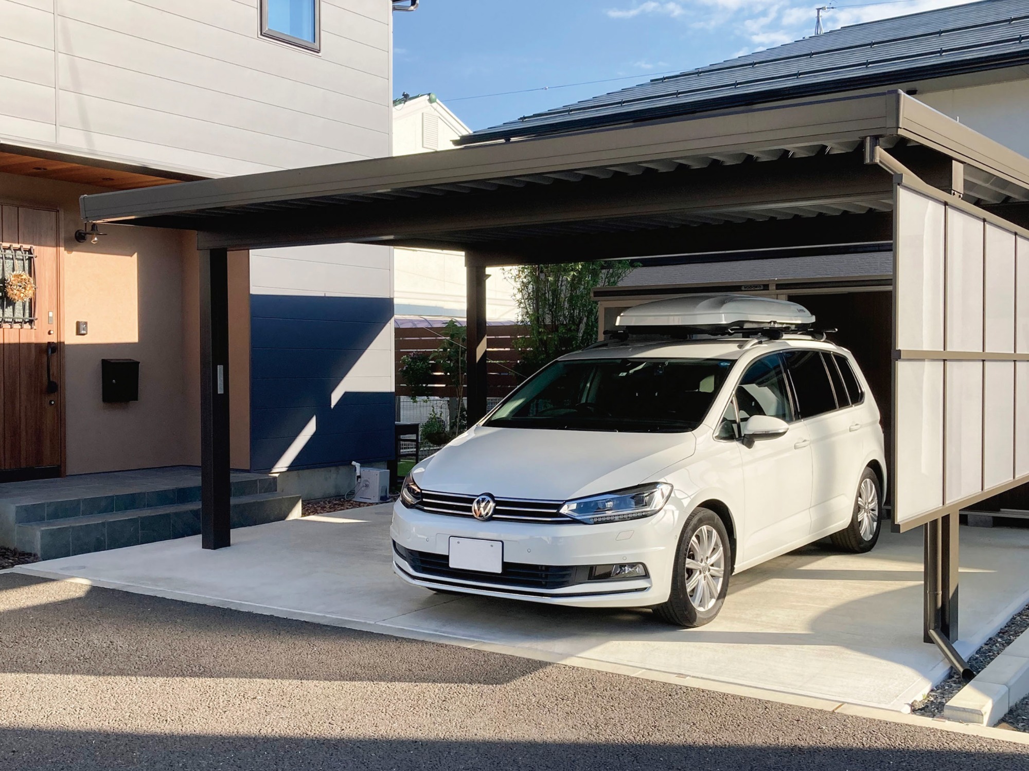 カーポートにサイドパネルを設けたことで隣地からの視線も気にならず、プライバシーが守られた安心の空間に。夕方には西日も和らぎ、ゆったりとした時間を過ごしていただけます。