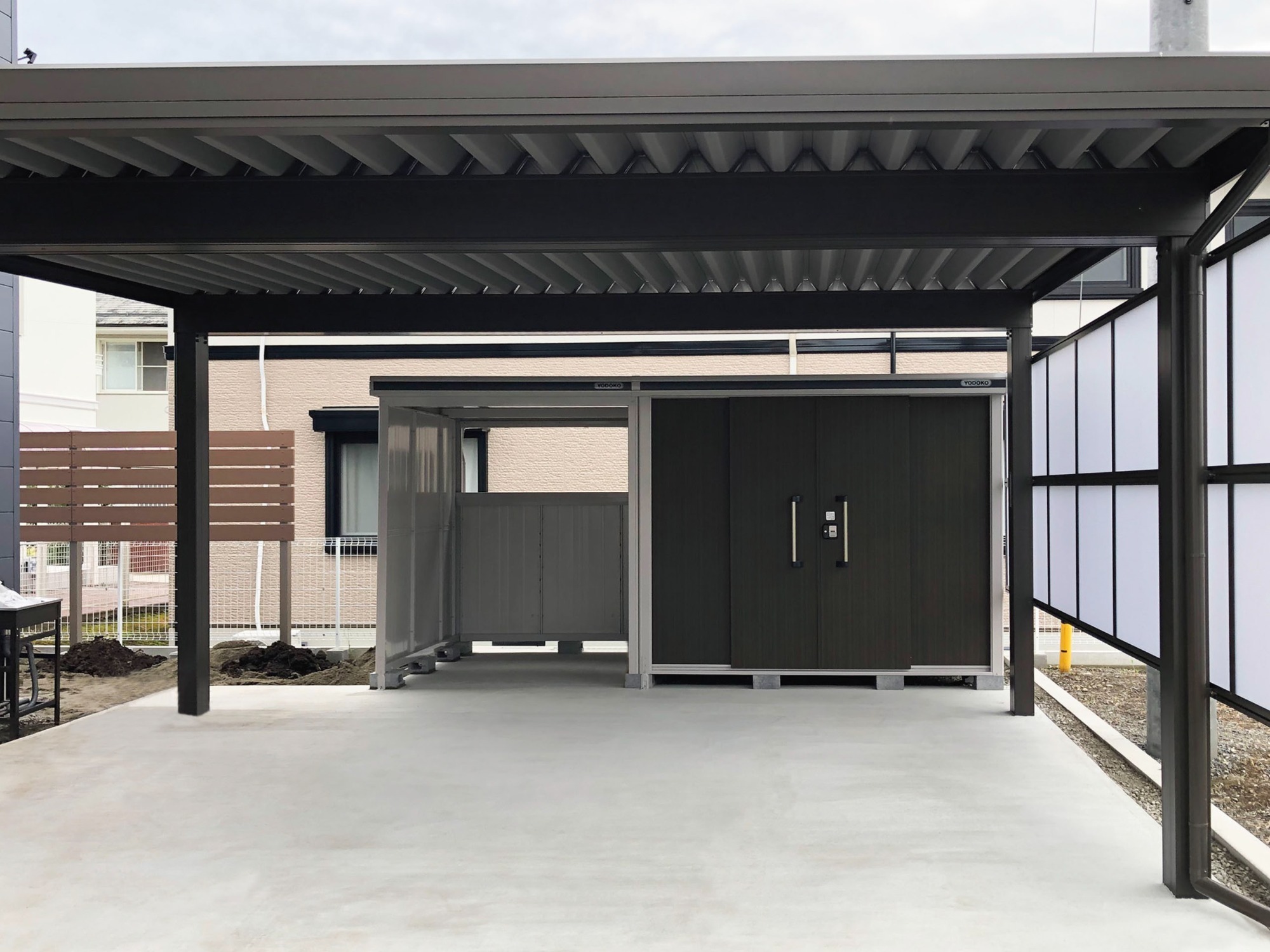 カーポートを設置(2台用)して、隣地にはサイドパネル2段仕様を取付けて、プライバシーの確保と西日を遮ることを考えたい。サイドパネルの高さも打ち合わせをして決めました。カーポートの奥には、ヨド物置のヨドコンビ(自転車置場と物置が一体になっている)を設置。背面の目隠しと車から近い位置に物置を設置する提案をしました。