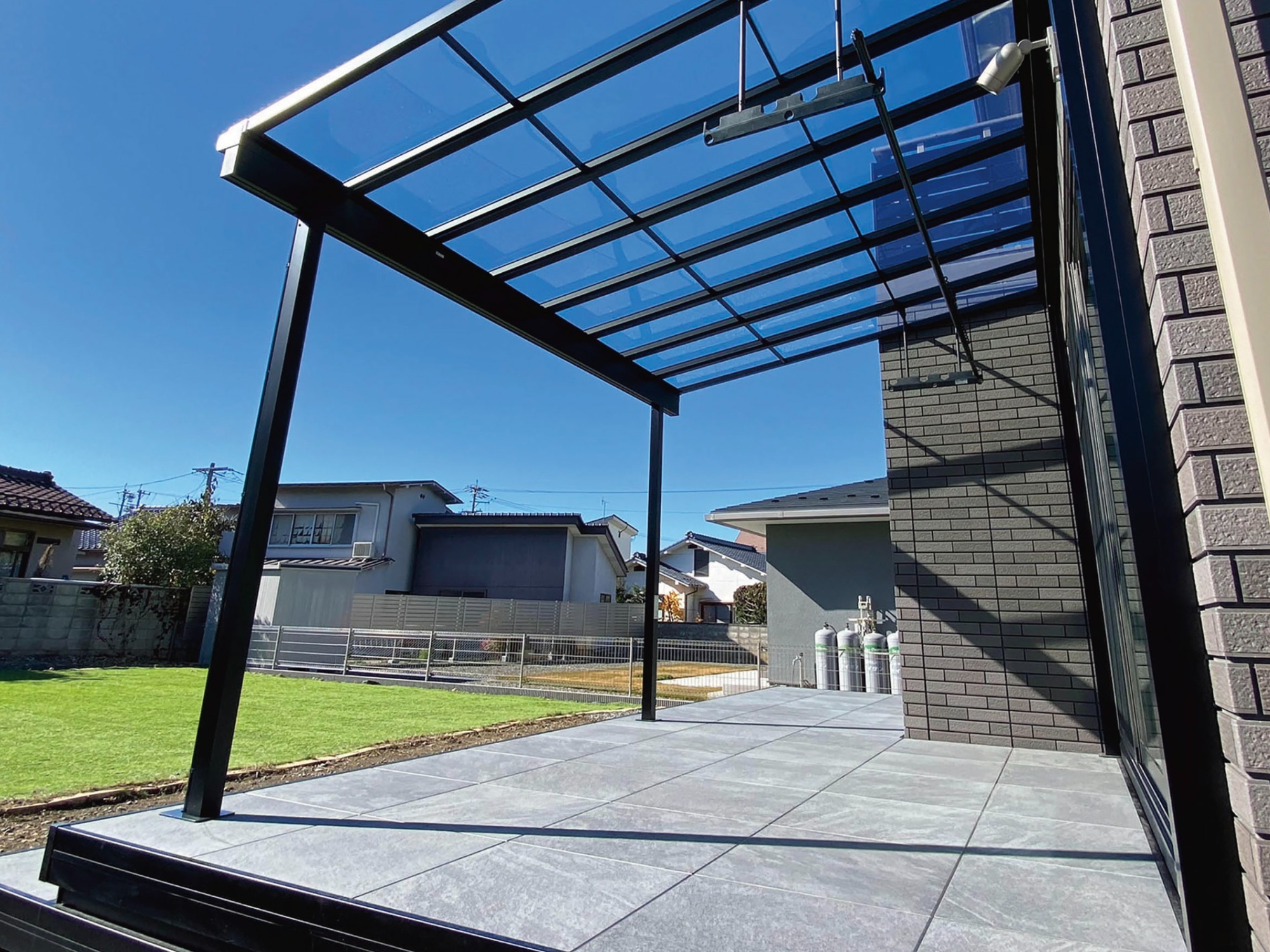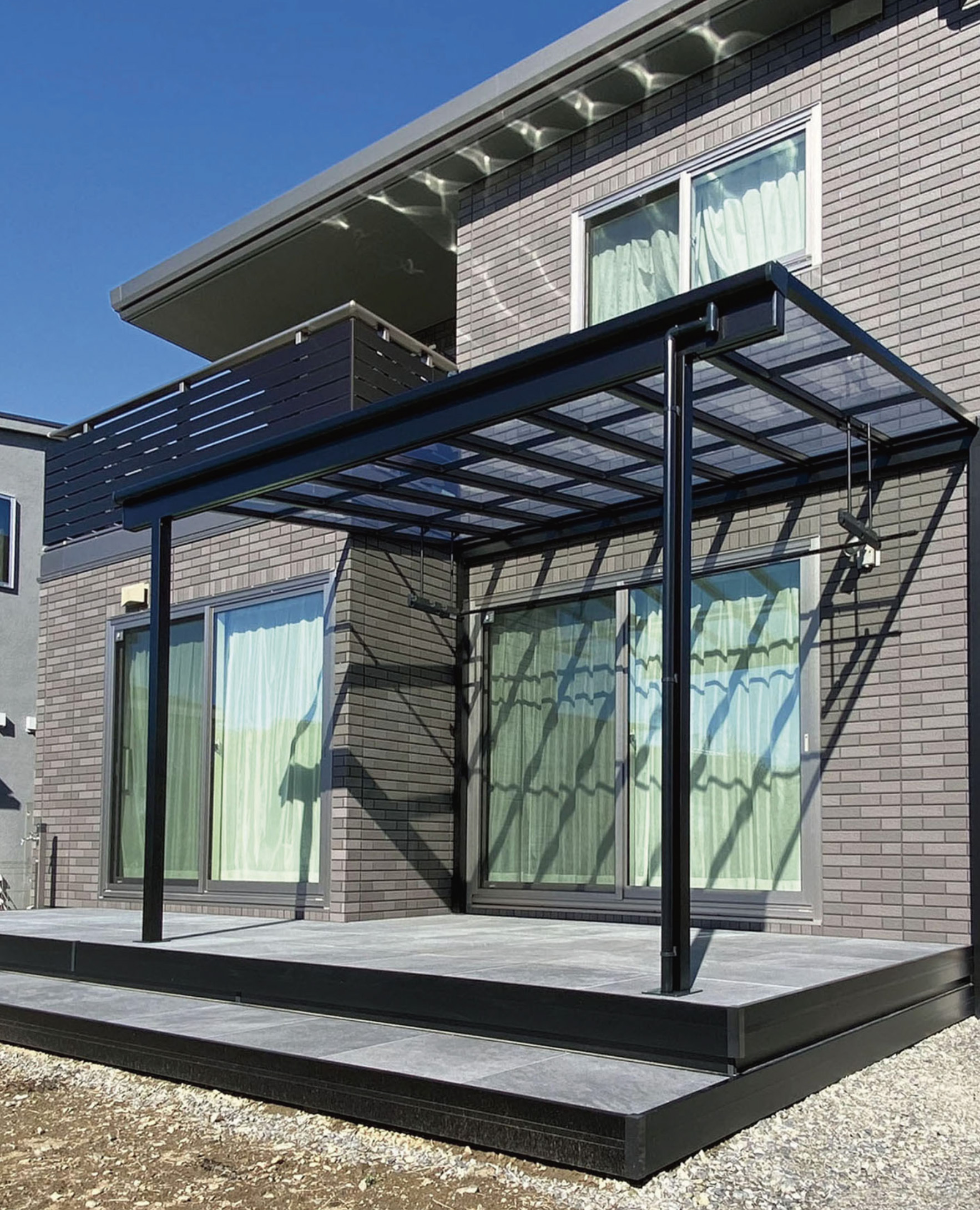 テラス屋根は施工性とコスト面を含め、スピーネを採用させて頂きました。屋根材に熱線吸収アクアを使用することで屋根の美しさを保てます。