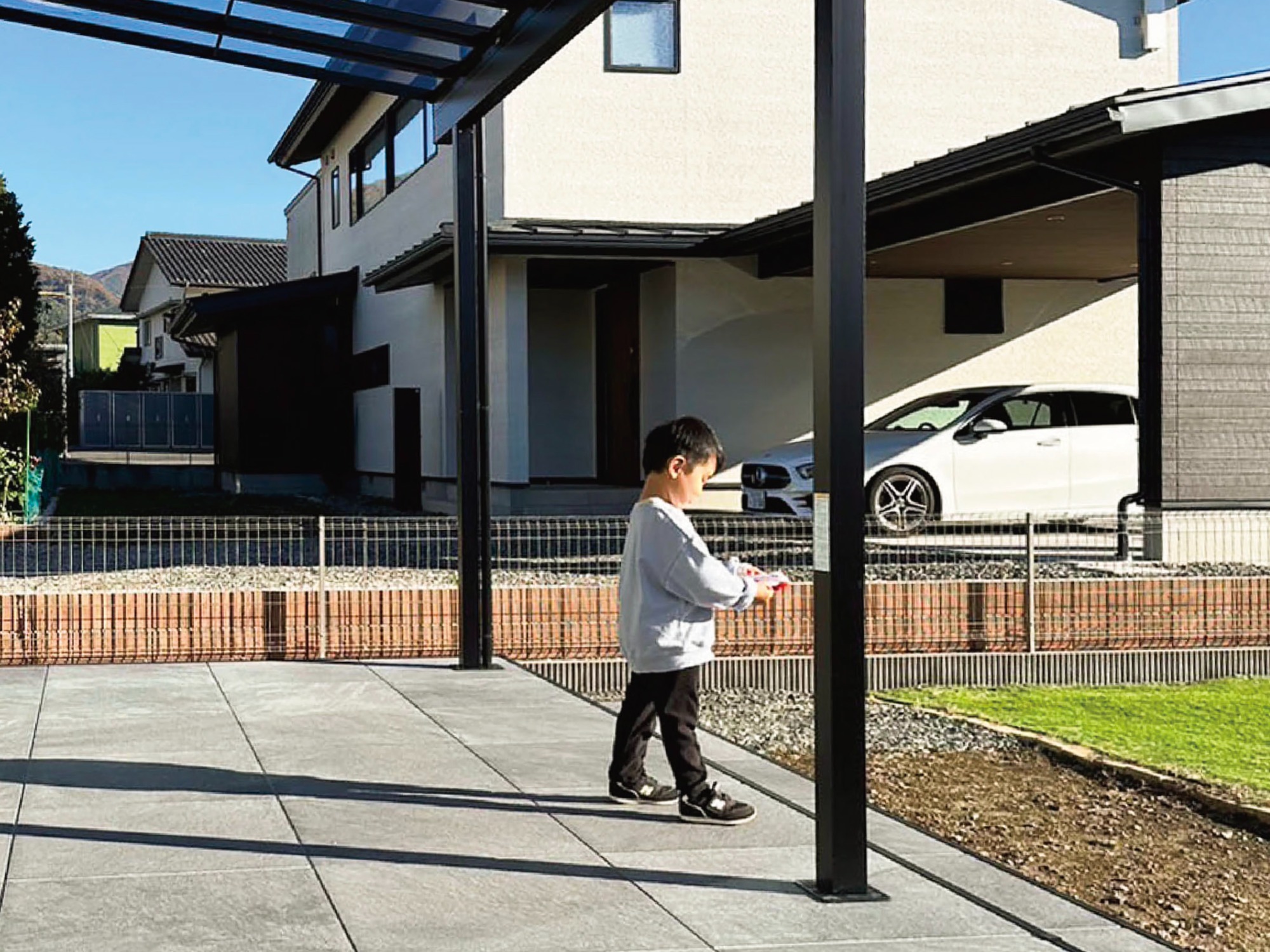 リビングから直通のテラスができて満足です。リビングの掃き出し窓から子供たちも喜んで飛び出して屋根の下でプラレールなどで遊んでいるとおっしゃっていました。早速BBQも家族で行ったそうです。1階で洗濯物も干せることなど笑顔で語ってくださいました。