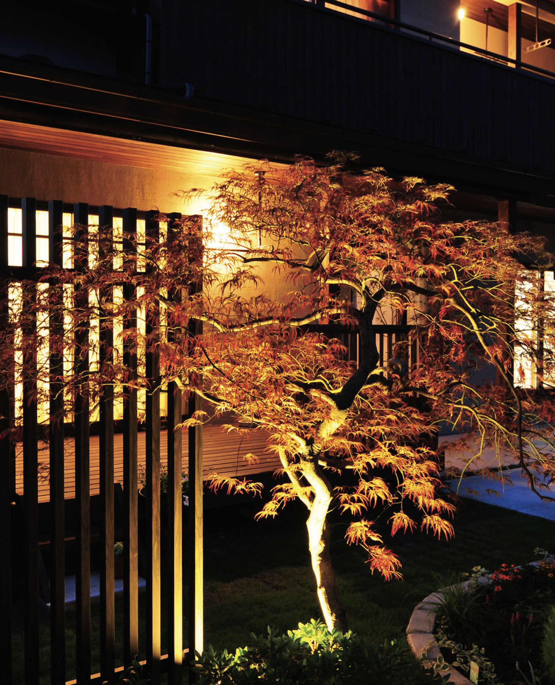お施主様のおじい様が大切にされていたもみじを移植し、シンボルツリーとして配置。さらに花壇や植栽を敷地内にバランスよく配し、建物本来の木の質感をより引き立てるプランとしました。夜にはライトアップによって室内からの眺めや街並み全体にも配慮し、昼と夜で異なる魅力を楽しんでいただけます。