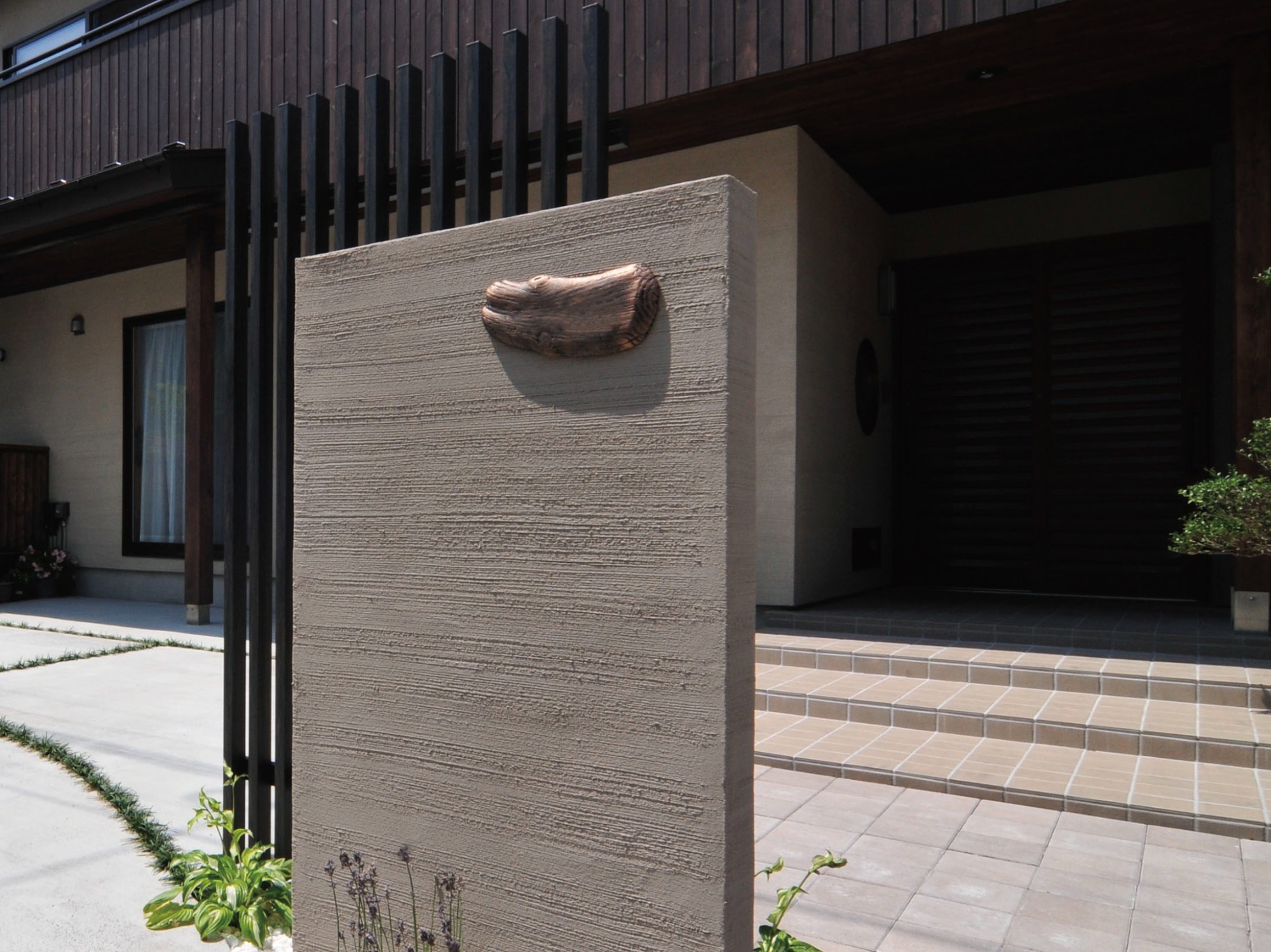 門柱:家の壁に合わせた色、パターンで仕上げました。個性的な表札がキラリ!