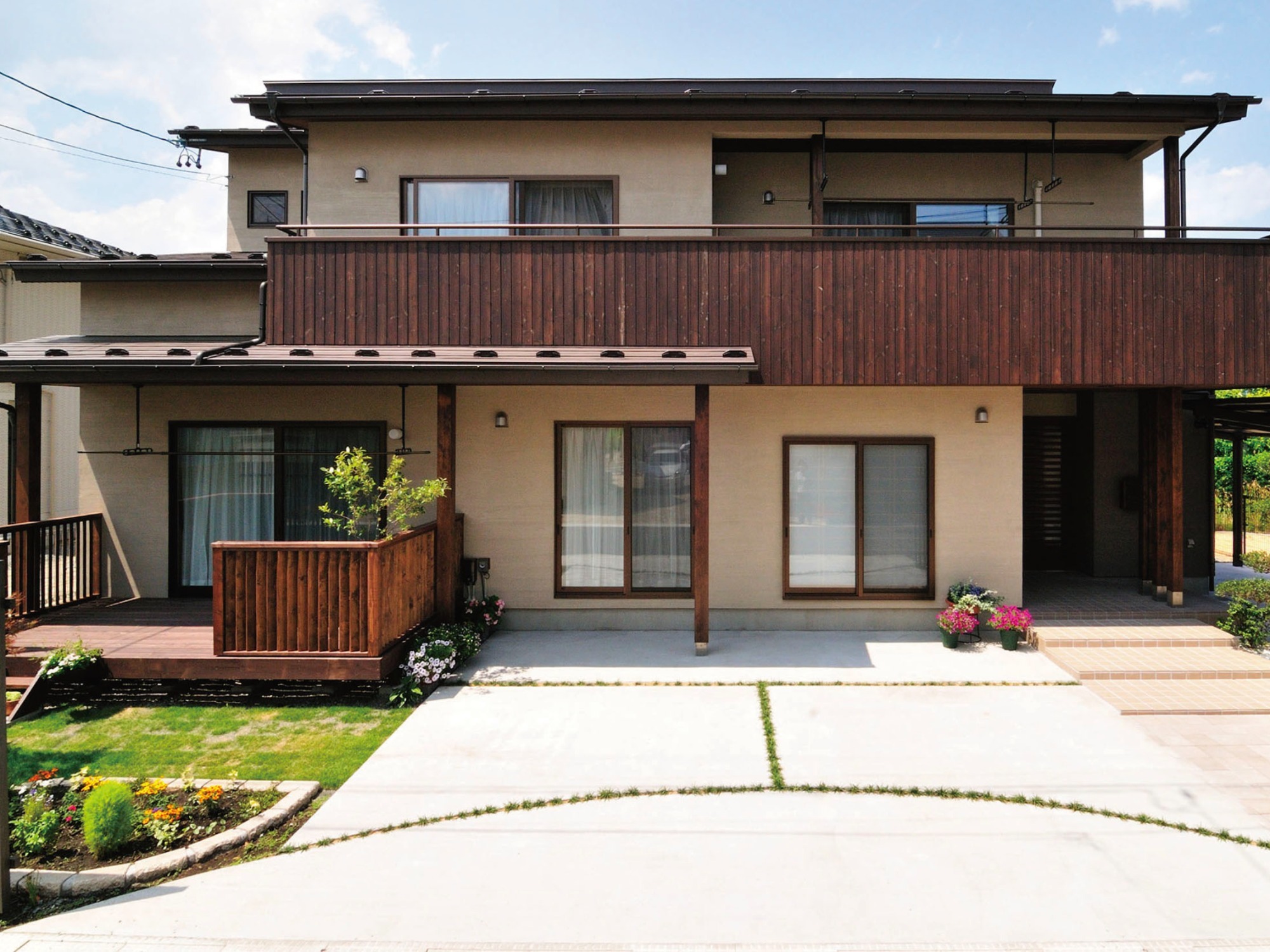 アプローチは滑りにくい素材を使い、段差を通常の半分に抑えて踏面を広くとり、ご家族が安心して歩けるよう工夫しました。駐車スペースは常用の2台分をカーポートで覆い、来客用の2台分には草目地を取り入れて、車がない時でも美しく見えるようデザイン。リビング前には植栽スペースと縦格子フェンスを設け、やさしく視線を遮りながら落ち着いた空間を演出しました。