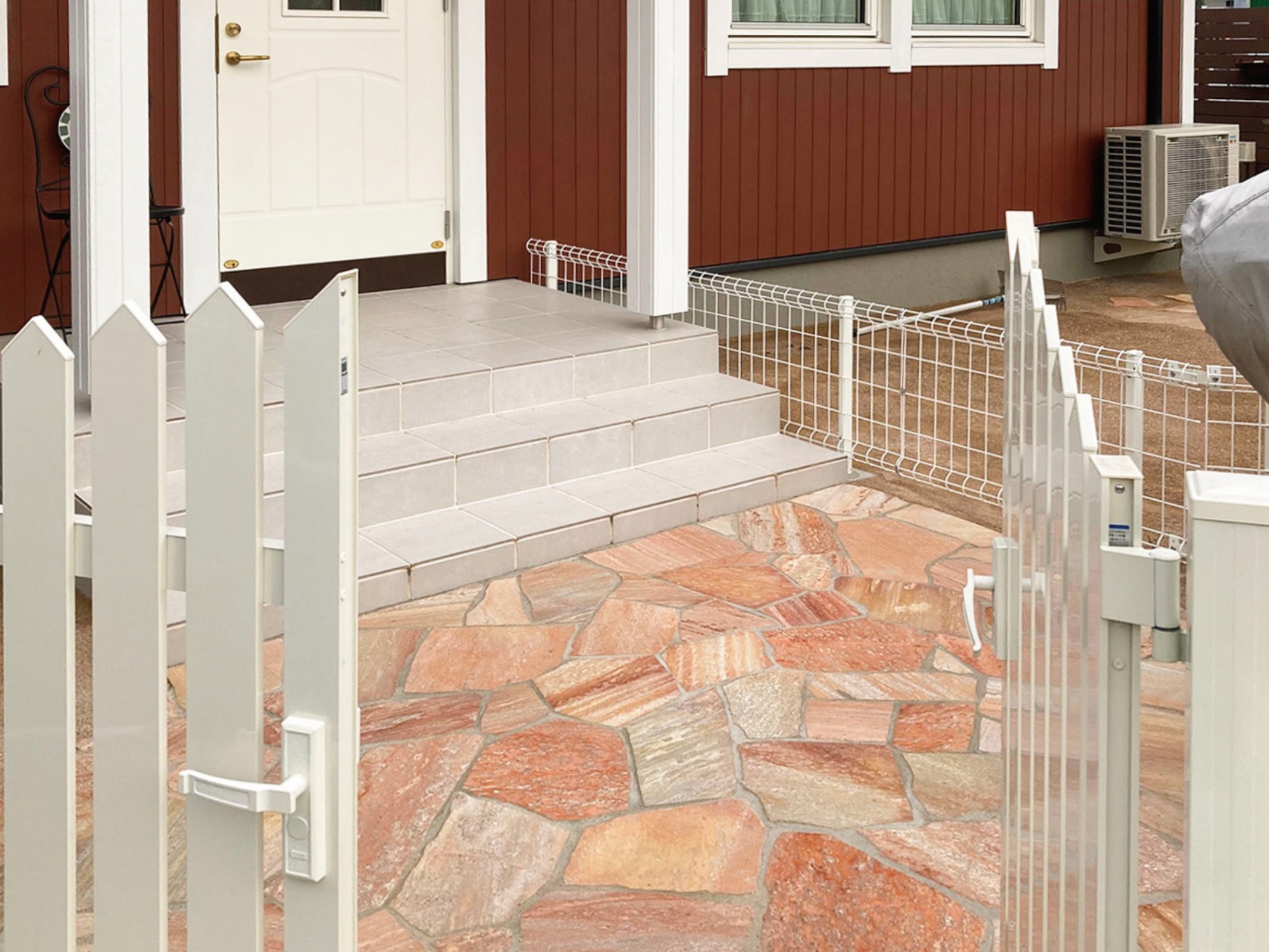 アプローチにはエルドラドクウォーツ・ピンクを使用し、やさしい色合いがご家族や訪れる方を迎え入れてくれます。