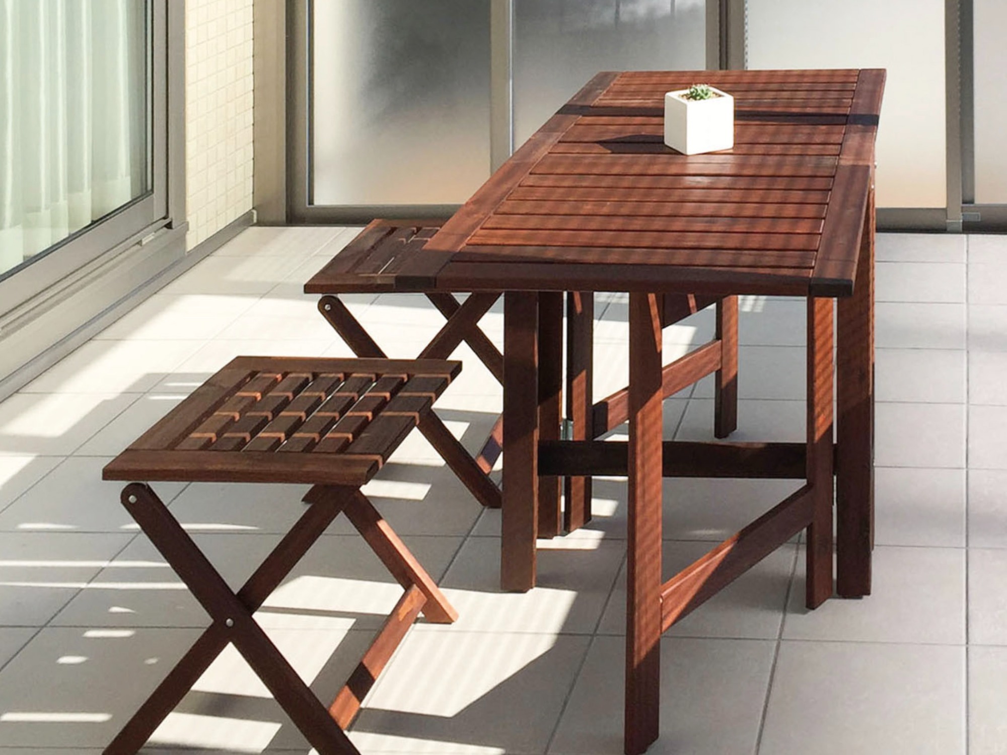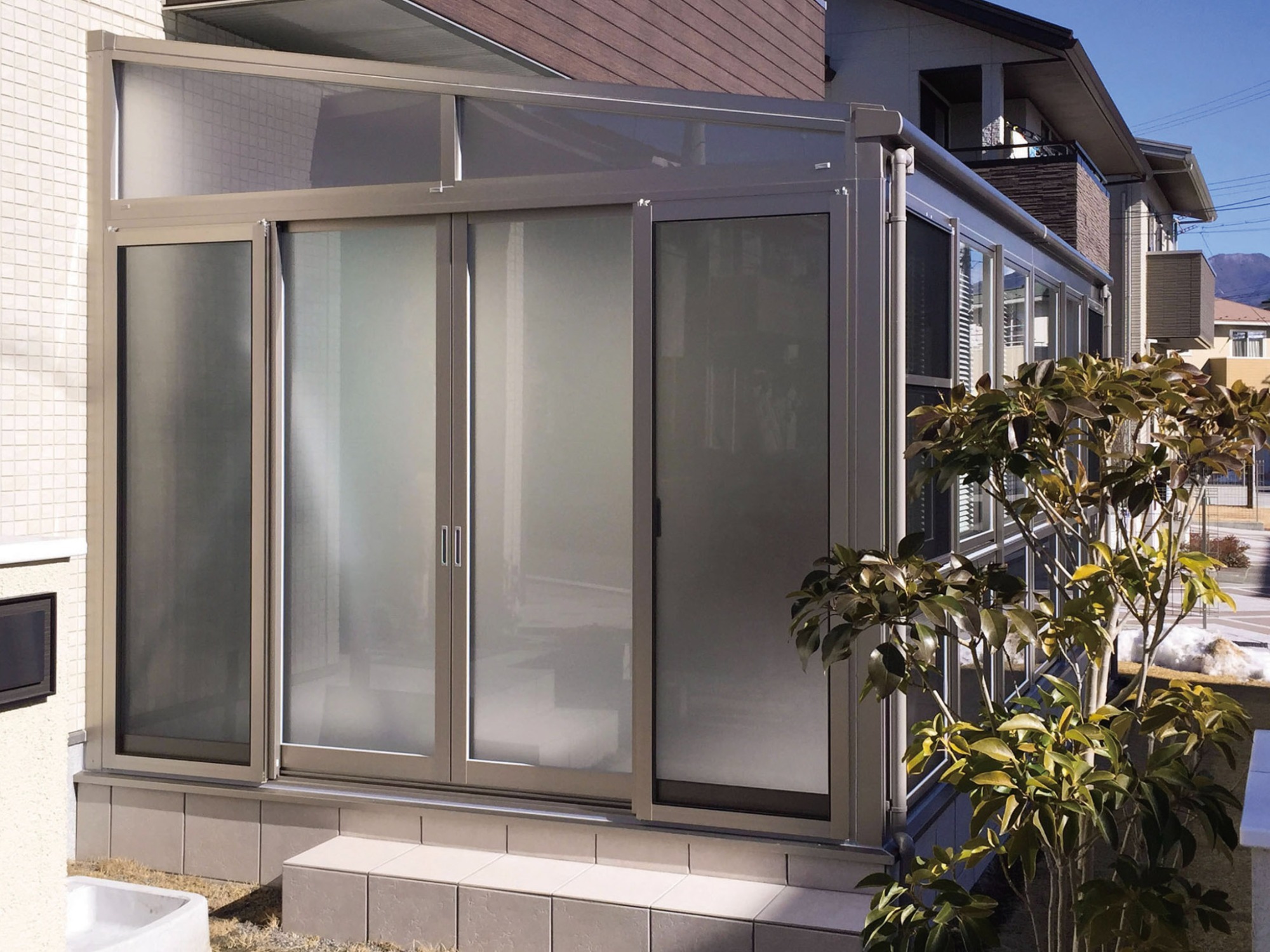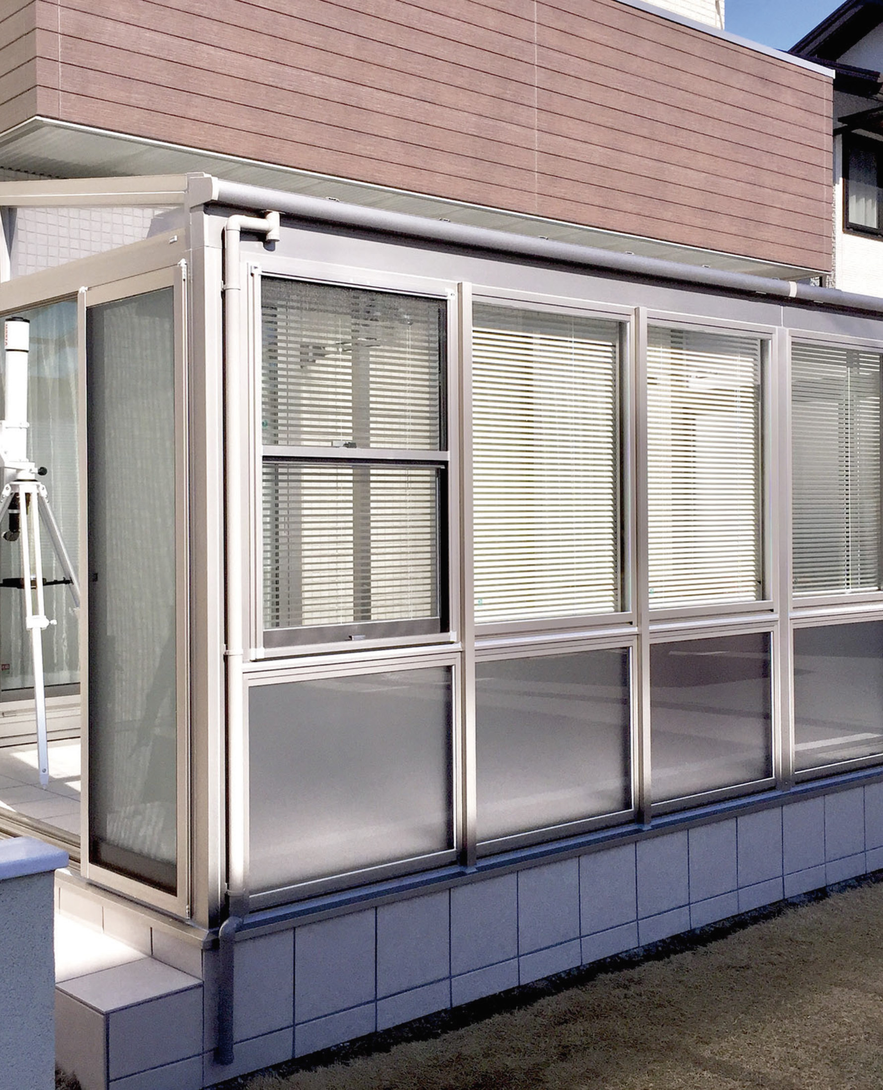 既存アルミテラスに前面・側面を囲い工事、タイルテラス打ち増し、ビル用サッシ LIXIL PRO-SE