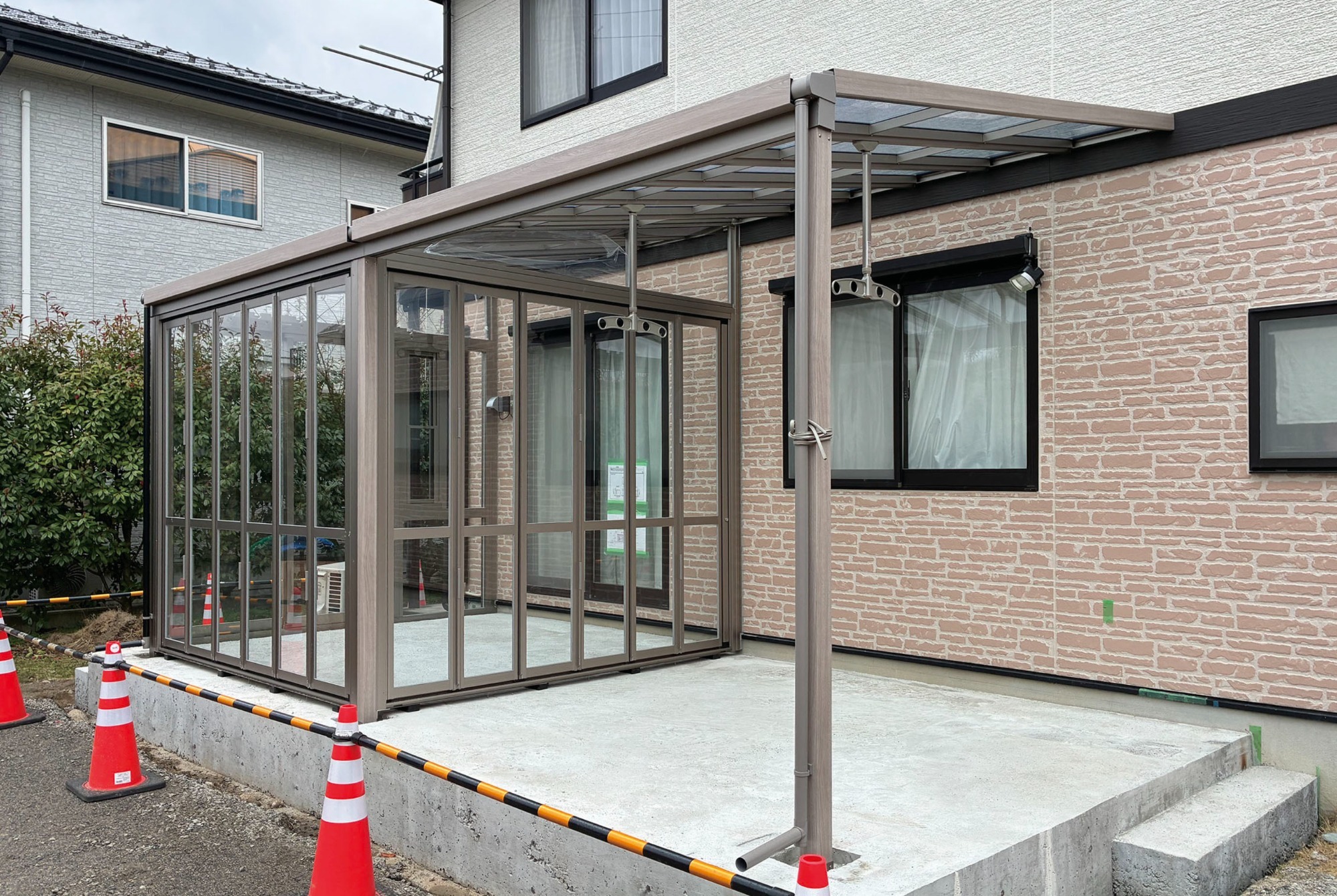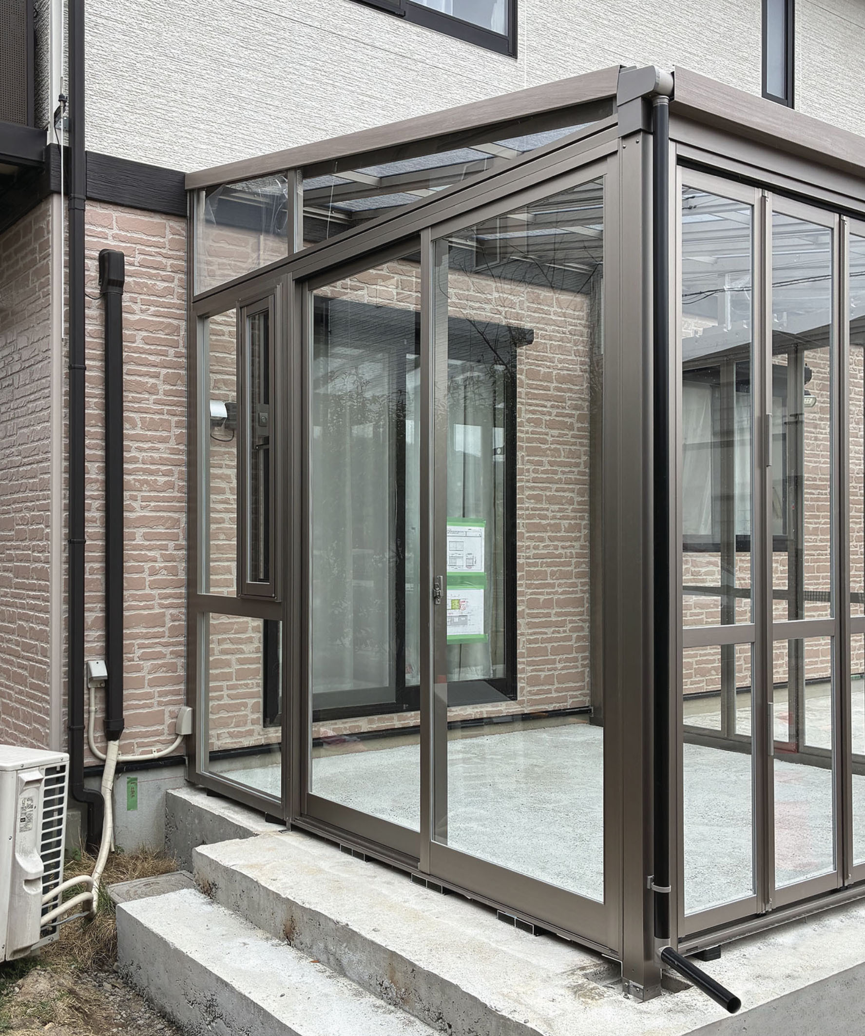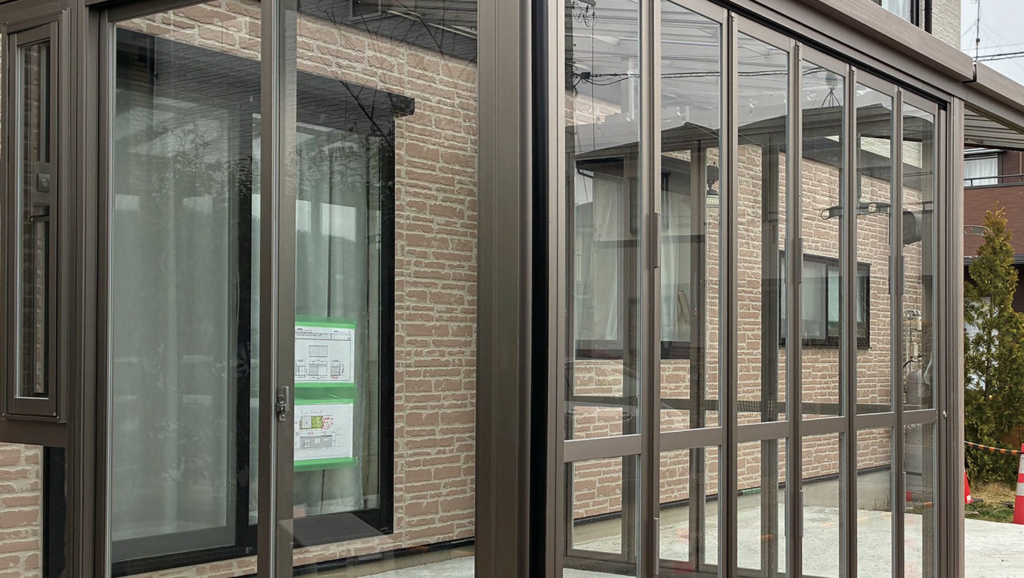 ガーデンルームの柱が建ち、屋根もしっかりと据え付けられました。躯体(くたい)が出来上がると、その存在感に圧倒されますが、ここからが専門店の腕の見せどころ。これから建具の細かな立て付け調整をミリ単位で行い、スムーズな開閉と高い気密性を確保していきます。