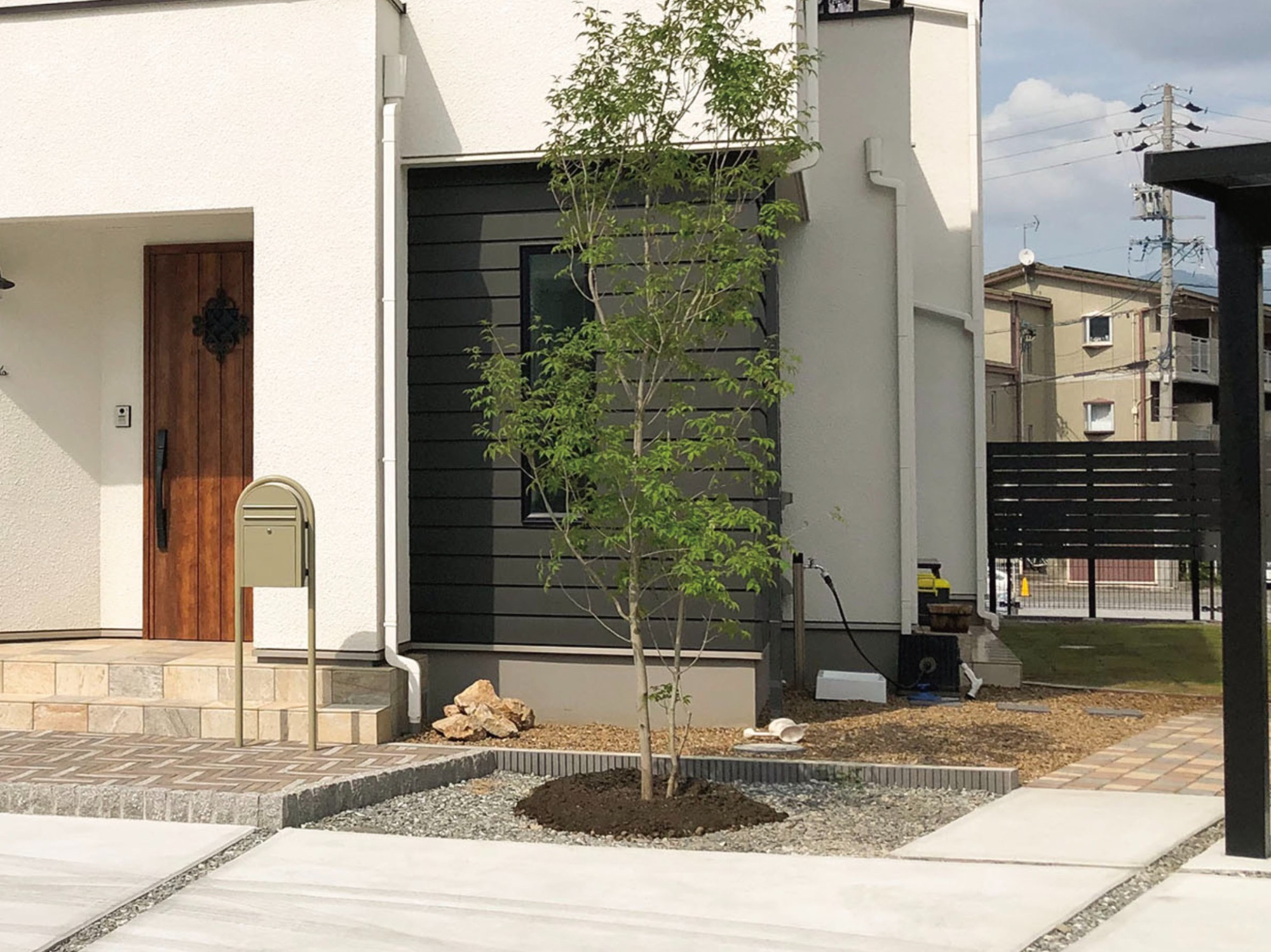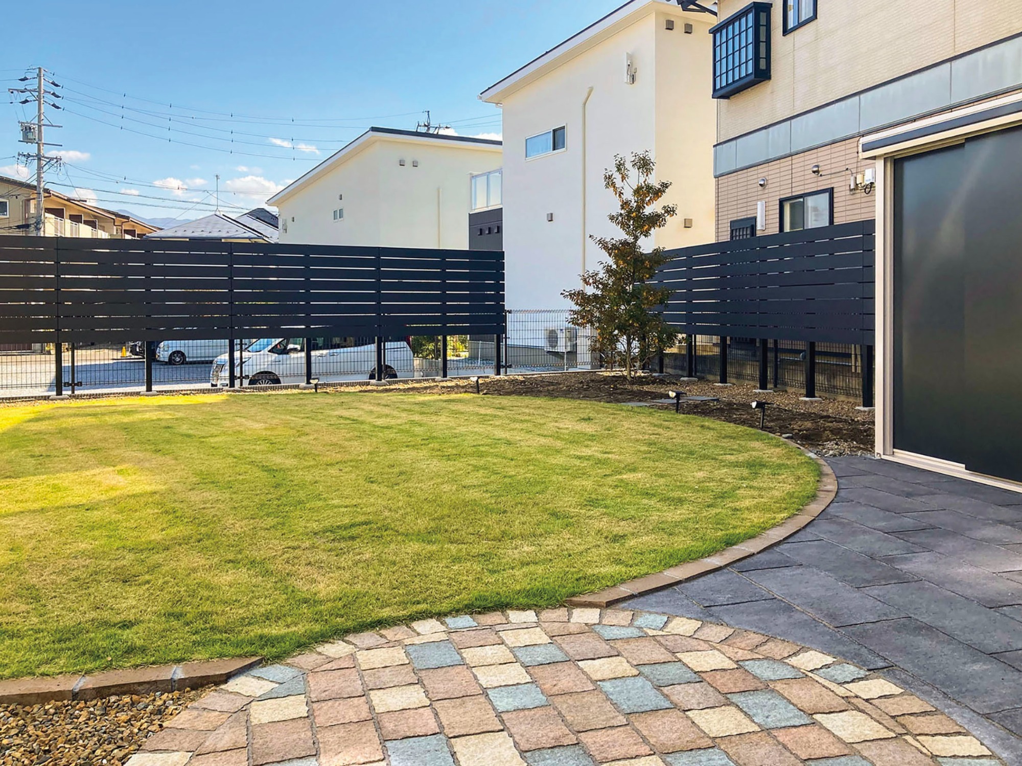 お庭の中心となる天然芝は、ご主人が肥料やお手入れに熱心に取り組んでくださっていて、「趣味になりそう」「天然芝にして本当に良かった」と嬉しいお言葉をいただきました。芝の青さが加わることで、お庭全体が明るく、家族の憩いの場として心地よい空間に仕上がっています。