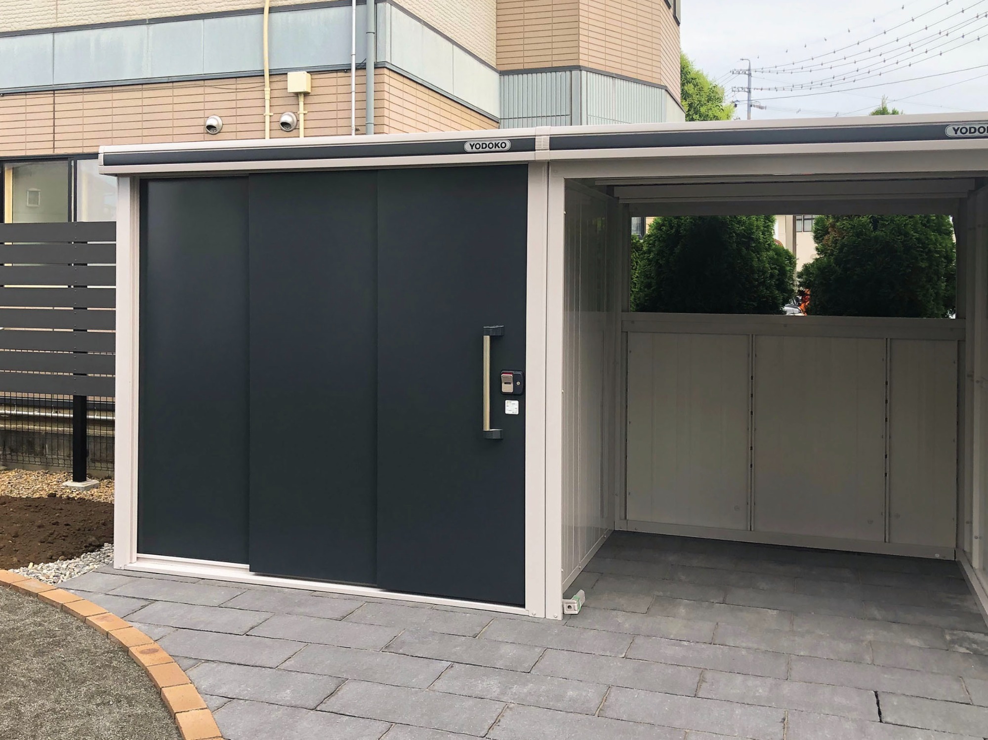 スクリーンフェンス(エコボードフェンス)/ヨド物置コンビ/TOYO ガンデブリック張り/植栽/コウライ芝