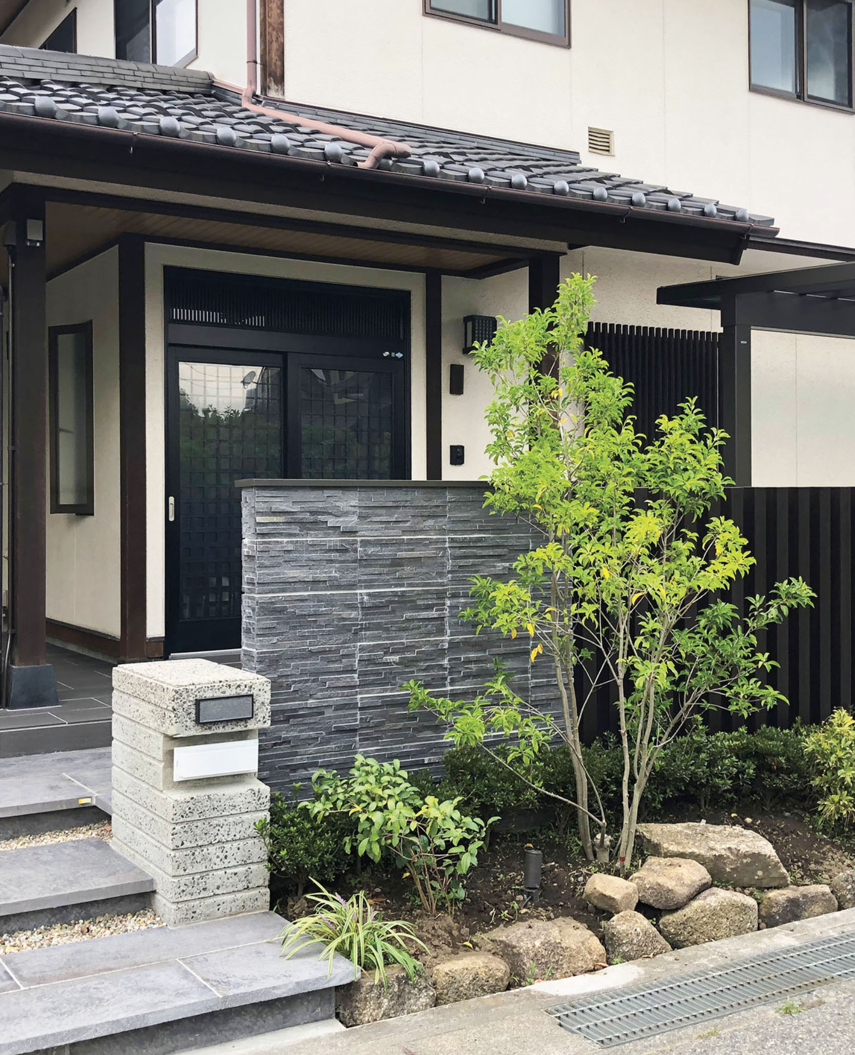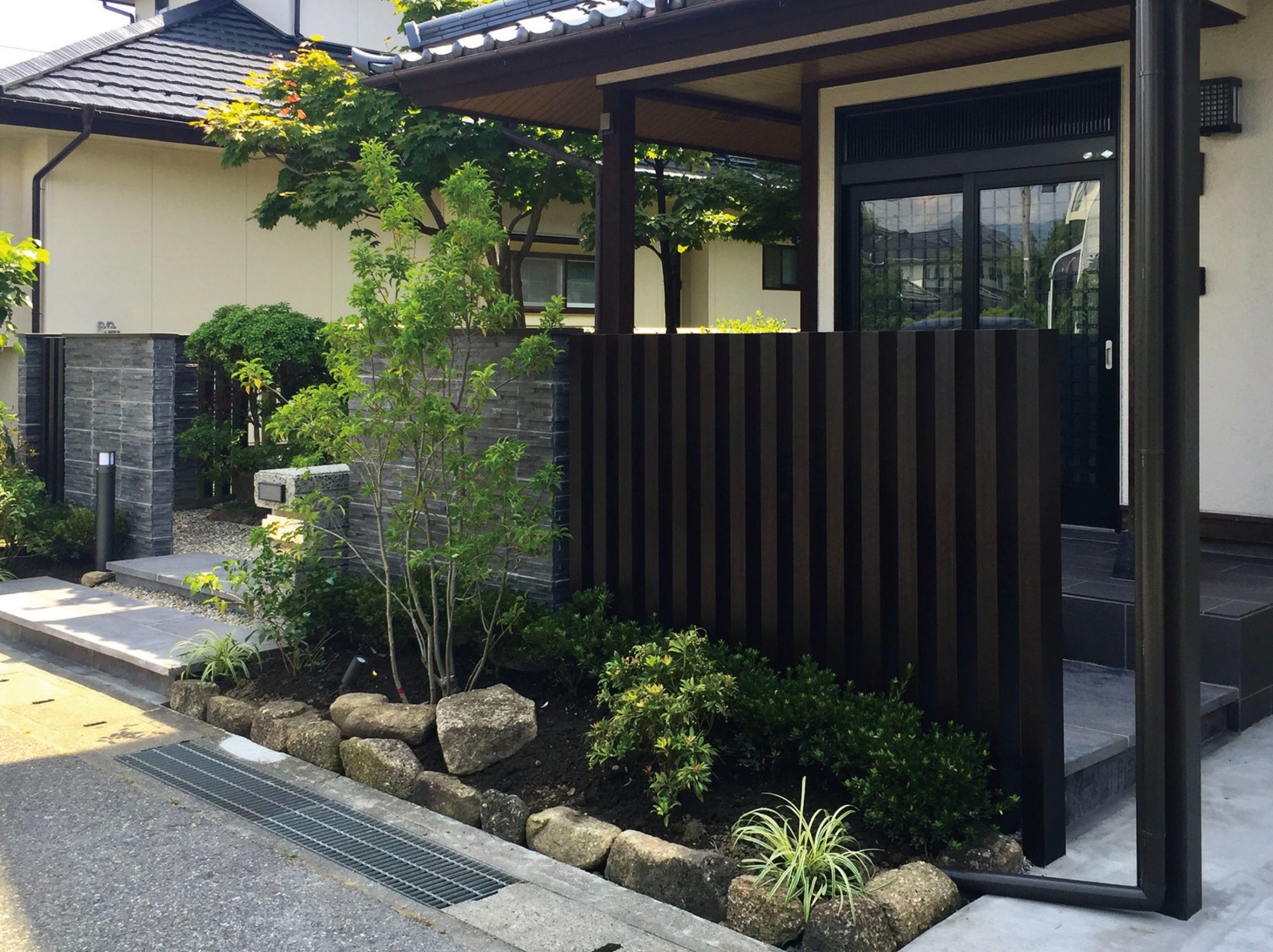 玄関まわりはシンプルでありながら上質さを感じられるよう、アルミスリットや敷石を効果的に配置。カーポートと植栽を組み合わせることで、実用性とデザイン性を両立した空間に仕上げています。リ・ガーデンによって、駐車スペースとしての機能性が高まっただけでなく、住まいの第一印象をさらに美しく演出できたのではないかと思います。