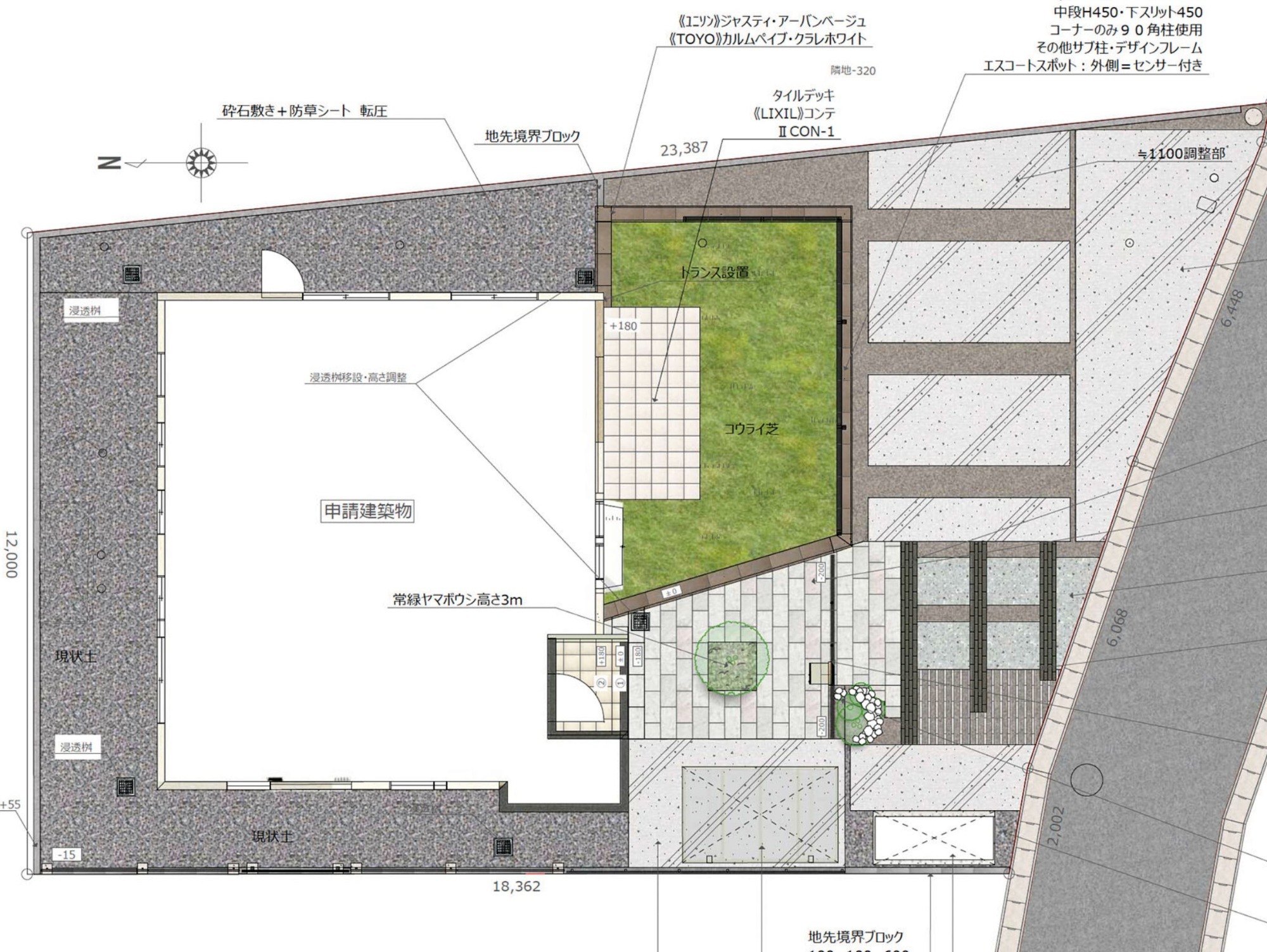 シンボルツリーは常緑ヤマボウシ。インターロッキングはTOYOシフレ。