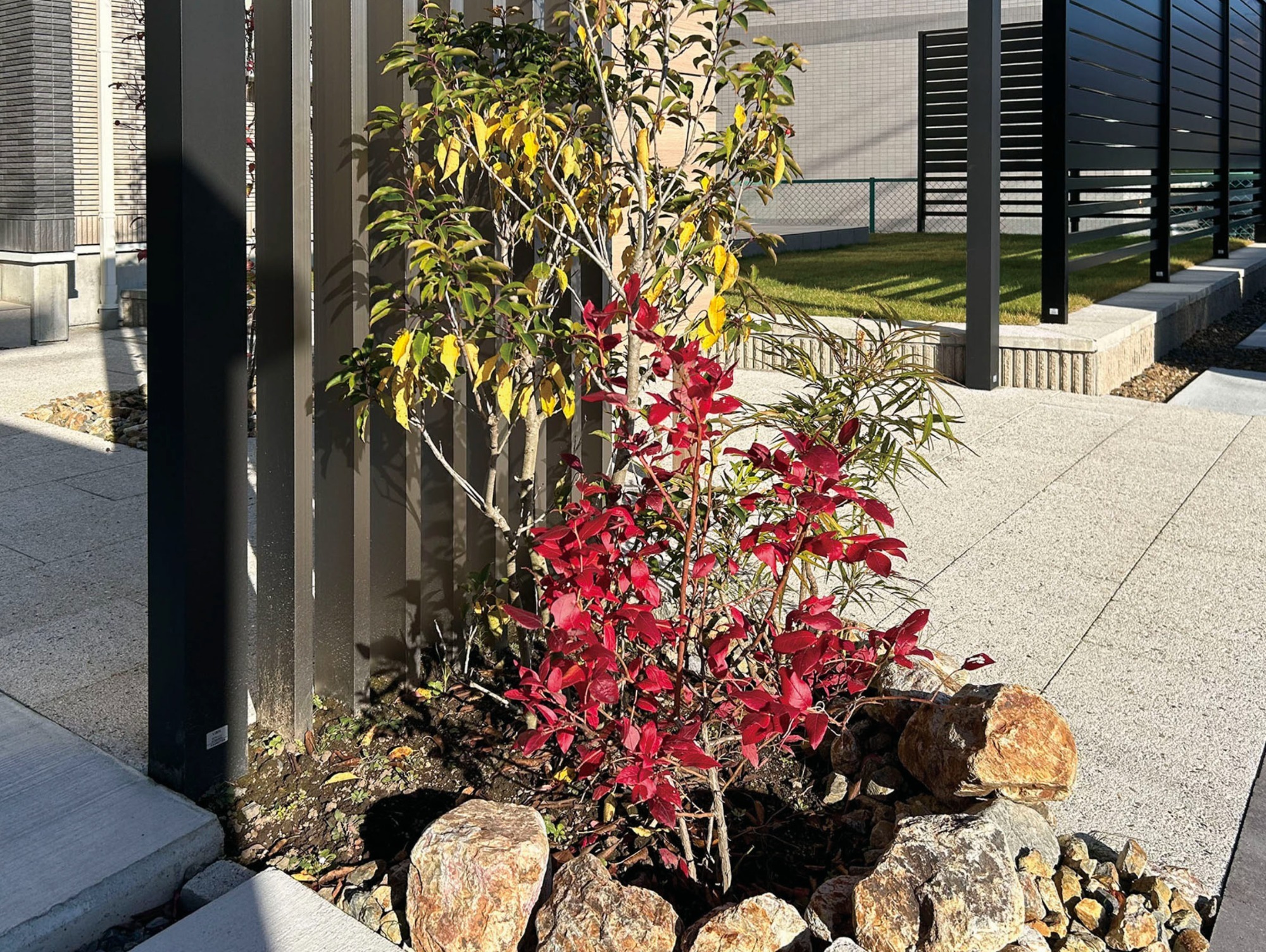 プラスGデザイン格子の前にソヨゴとブルーベリー。