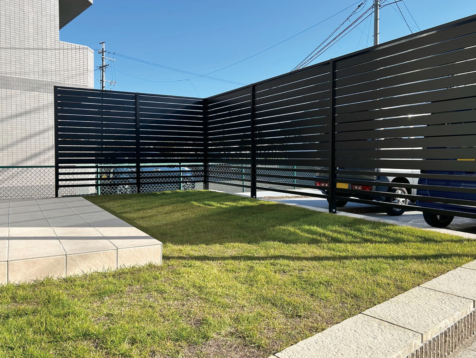 コウライ芝の主庭にプラスG目隠しフェンスを配置。