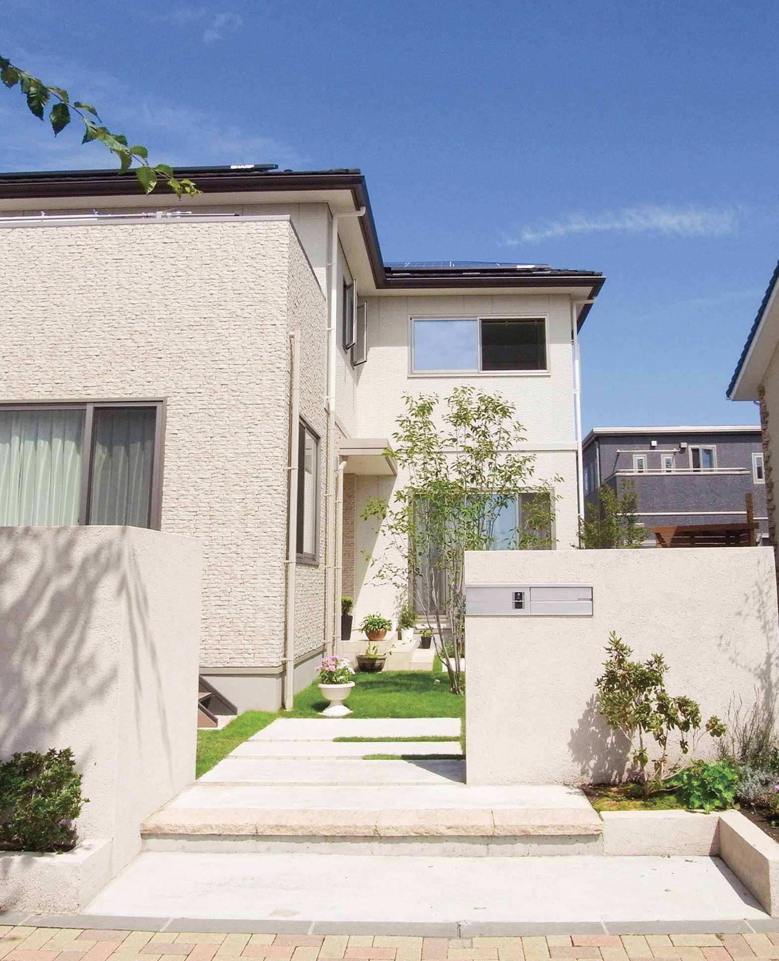 ファサードは、直線的なデザインとみかげ石を組み合わせ、キリリと引き締まったハンサムな印象に。重厚感がありながらも植栽を豊かに取り入れることで、外観全体にやわらかさと潤いをプラスしました。