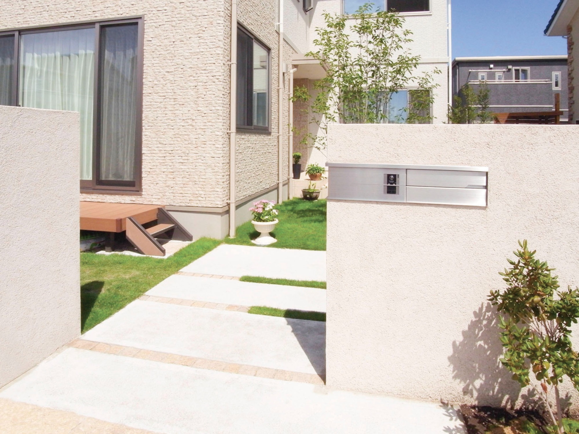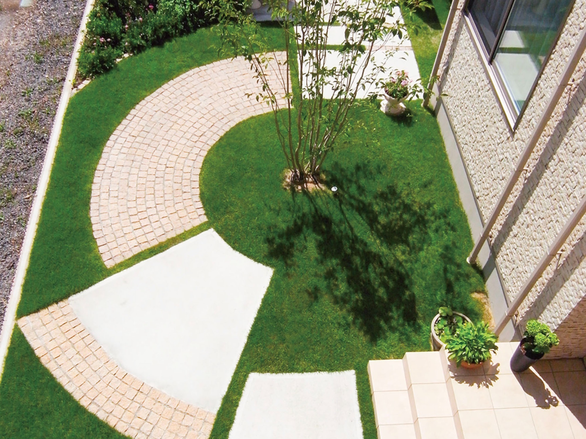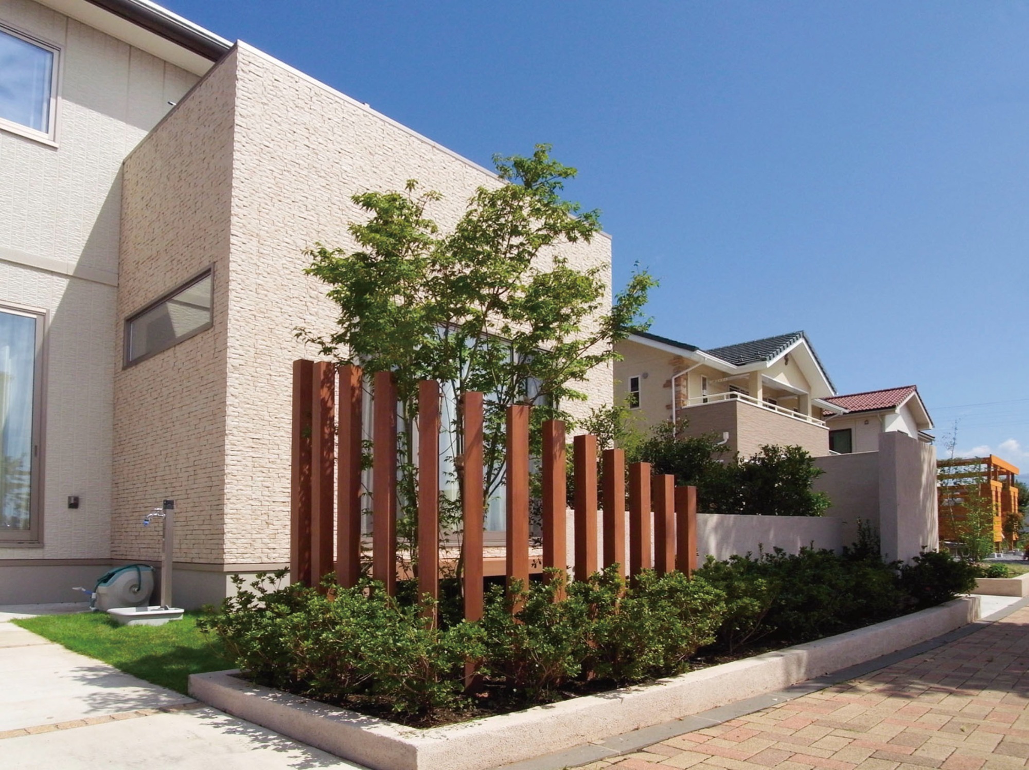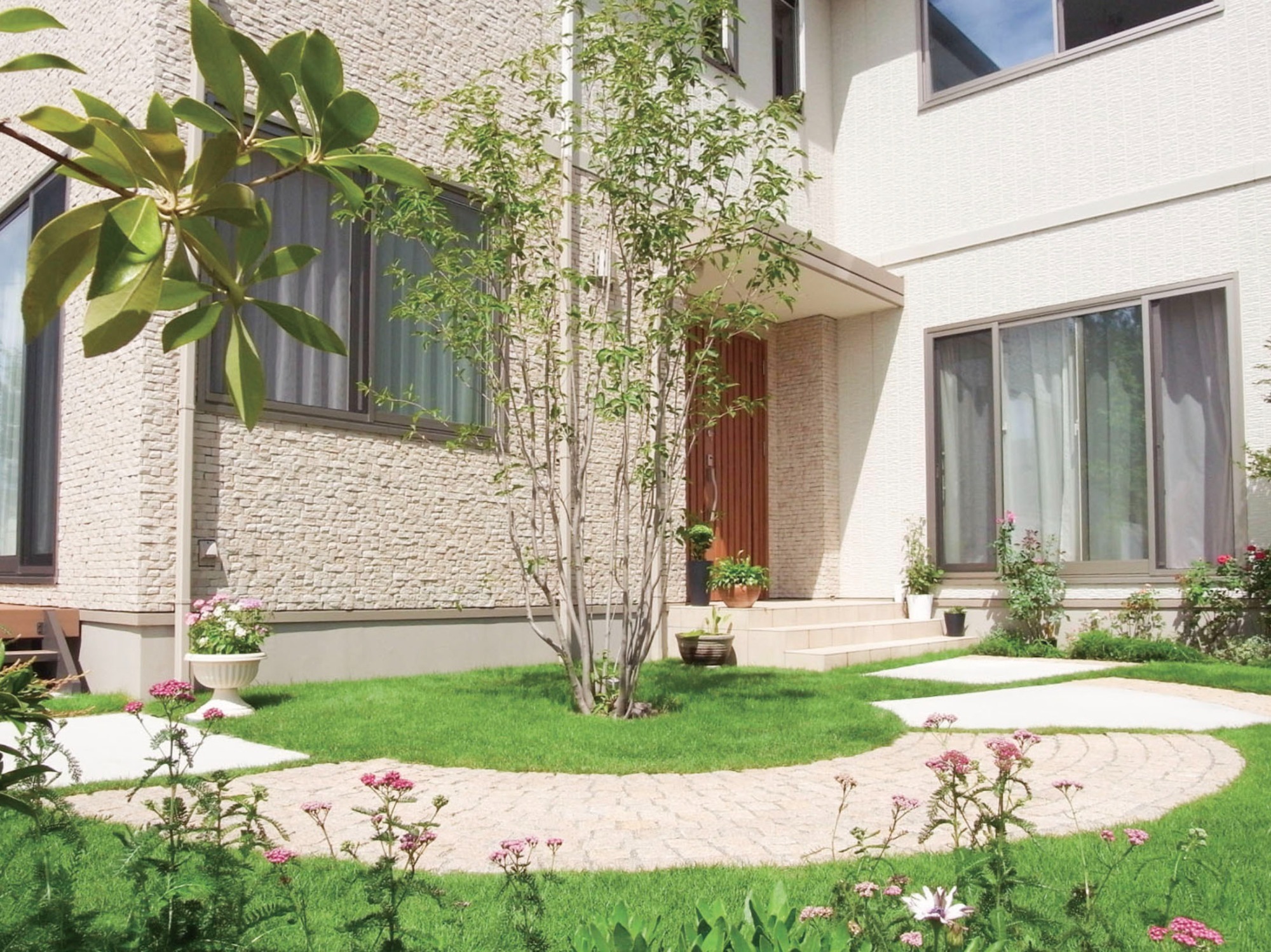 完成後はお客様がとても丁寧にお庭のお手入れをしてくださり、芝は青々と美しく育ち、季節ごとに咲く花々が訪れる人を迎えるフロントガーデンに。人工木デッキ《LIXIL 樹ら楽ステージ》も暮らしに溶け込み、ご家族の憩いの場として活用されています。